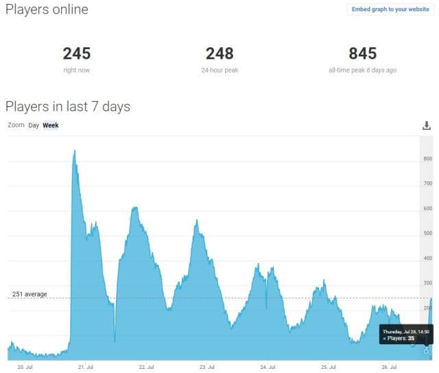 На момент публикации новости 24-часовой пик составляет 248 человек, а на графике видна ежедневная тенденция к потере и без того небольшой аудитории. Похоже, что вытянуть даже оригинал у Xaviant вряд ли получится.