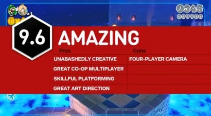 IGN поставил Super Mario 3D World 9,6 баллов из 10 возможных, автор статьи назвал игру очень креативной, похвалив арт-направление, интересный платформинг и мультиплеерную составляющую.