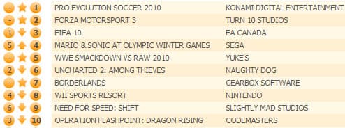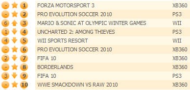 Вышеупомянутая Forza Motorsport 3 стала самой продаваемой игрой для Xbox 360. Uncharted 2: Among Thieves опустилась на шестое место (-53% продаж) - ее опередили Mario & Sonic at the Olympic Winter Games и новичок WWE Smackdown Vs Raw 2010.