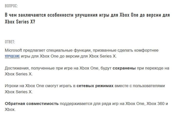 Что касается Xbox Series X, то обратная совместимость поддерживается для ряда игр на Xbox One, Xbox 360 и Xbox. Достижения, полученные в версиях для Xbox One, переносятся в издания для Xbox Series X. Игроки на Xbox One смогут играть в сетевых режимах вместе с пользователями Xbox Series X.