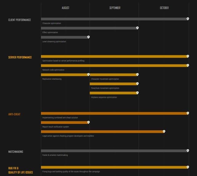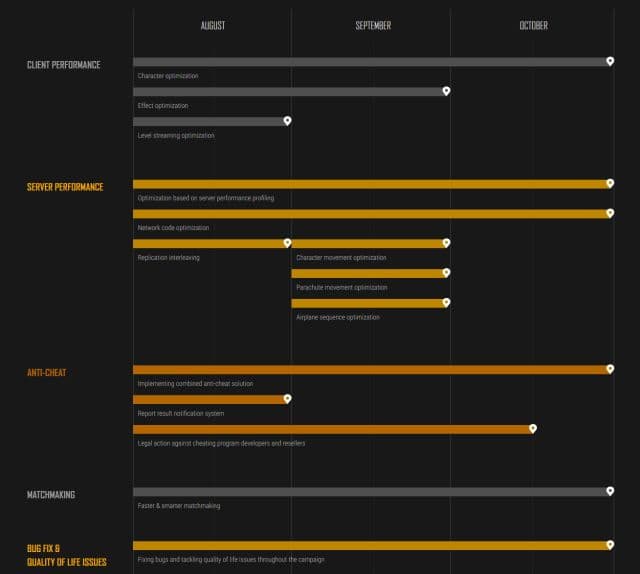 В рамках кампании, названной «Починим PUBG» (Fix PUBG), разработчики намерены улучшить оптимизацию эффектов и загрузки уровней, улучшить работу серверов и сетевой код, предпринять меры, в том числе юридические, против создателей и продавцов читов, сделать более быстрый матчмейкинг, а также избавить проект от многочисленных багов. «Починим PUBG» продлится как минимум три месяца (с августа по конец октября).