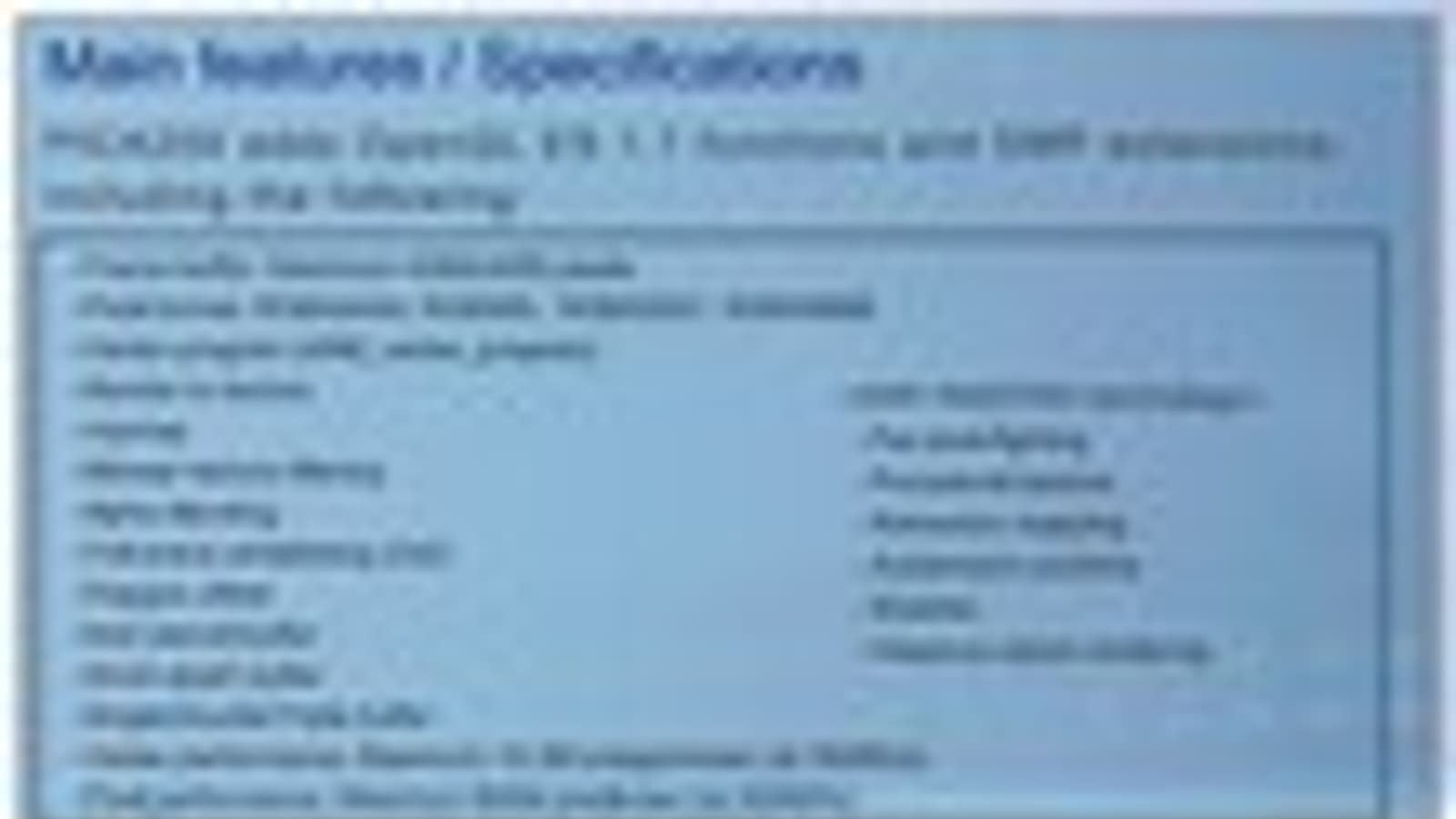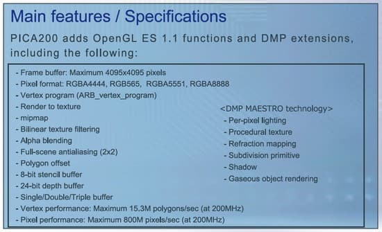 «PICA200 использует четыре конвейера и работает с четырьмя программируемыми вершинными процессорами. 3D-ядро использует патентованную графическую технологию MAESTRO-2G, а также ряд алгоритмов затенения (per-vertex sub-surface scattering, bidirectional reflectance distribution function, cook-torrance, polygon subdivision, soft shadowing)».