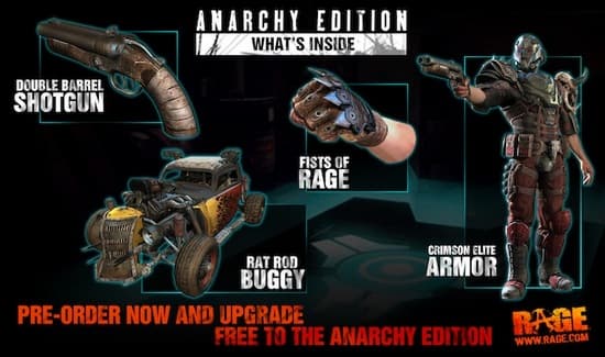 Все, кто оформляет предварительный заказ на стандартное издание RAGE, автоматически получают RAGE: Anarchy Edition, без дополнительной платы. Bethesda добавила, что Anarchy Edition, ранее заявленное только для американского рынка, будет выпущено и в Европе.