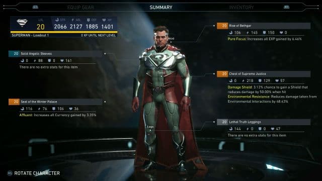 Герои в Injustice 2 зарабатывают опыт и растут в уровнях, что повышает их характеристики. Также они получают новые элементы брони, которые позволяют им стать сильнее. У каждого бойца четыре основные характеристики: сила, защита, здоровье и сила специальных ударов. Броня разделена на пять составляющих, защищающих разные части тела: голову, торс, ноги, руки и специальная вещь для каждого персонажа. Базовые костюмы не предлагают никаких бонусов.