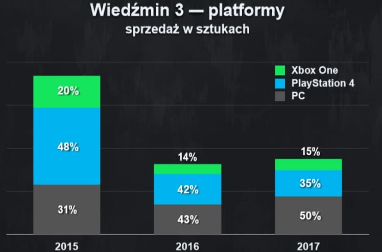 По имеющимся данным в проект студии на PS4 поиграло 10, 473 млн. человек. В марте на конференции, посвящённой итогам 2017 года, компания рассказала о процентном соотношении данных платформ продаж «Ведьмак 3» на протяжении трёх лет. На основании данных цифр и сделан подсчёт:
