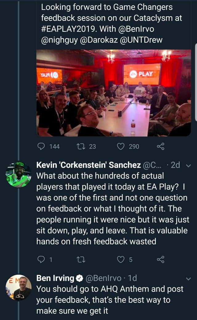 В рамках мероприятия EA Play компания Electronic Arts провела встречу с игроками, в ходе которой выслушала отзывы о «Катаклизме» для Anthem. Однако на встречу попали только блогеры, стримеры и другие «авторитетные люди» из числа участников программы ЕА Game Changers.