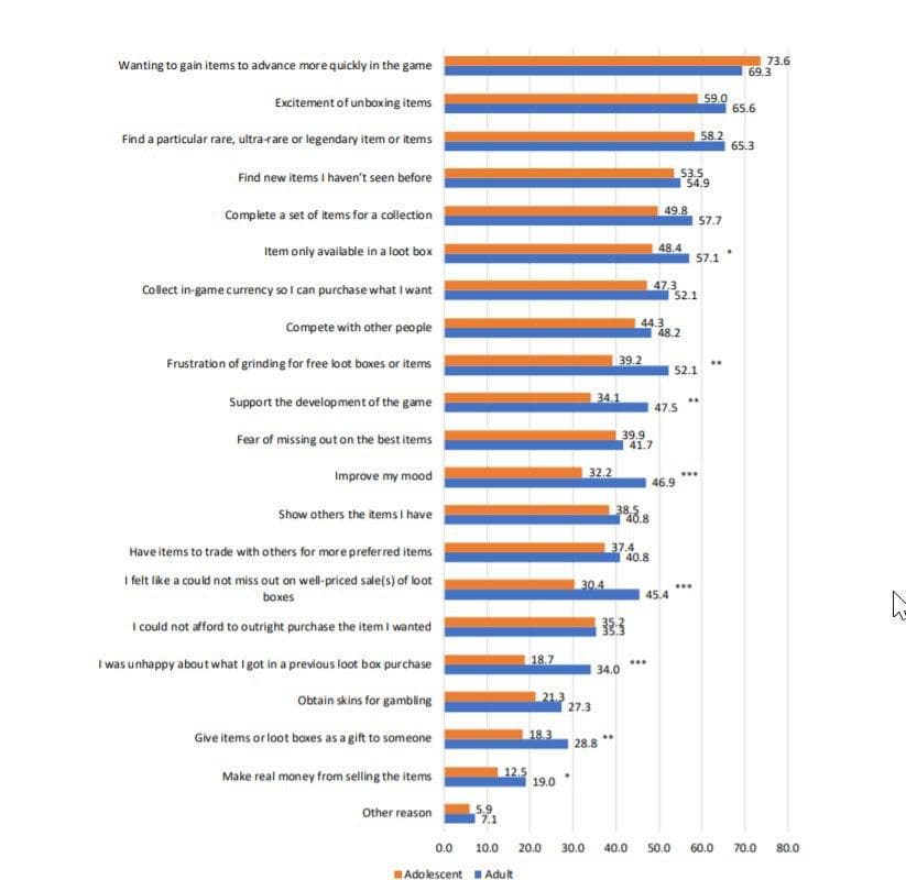Согласно исследованию, наиболее распространенной причиной покупки лутбоксов стало “более быстрый прогресс в игре”, при этом “азартная игра” стала мотивацией для 27,3% молодых людей и 21,3% подростков.