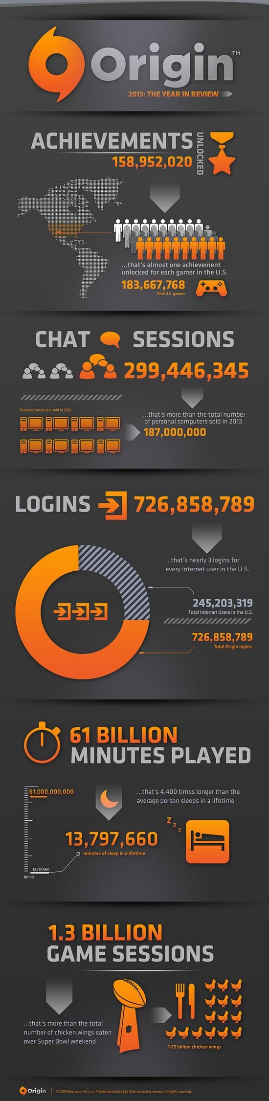 Компания Electronic Arts опубликовала инфографику по своему сервису Origin, из которой мы узнали, что в прошлом году пользователи суммарно провели за играи более 61 млрд. минут, что примерно равно 116 тыс. годам.