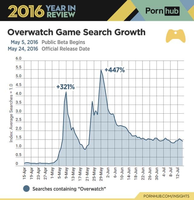 Также в 2016 году посетители Pornhub проявляли интерес к контенту по мотивам Overwatch и Pokémon Go. Два наиболее значимых всплеска интереса к Overwatch произошли на старте открытого бета-тестирования и в конце мая, когда игра поступила в продажу.