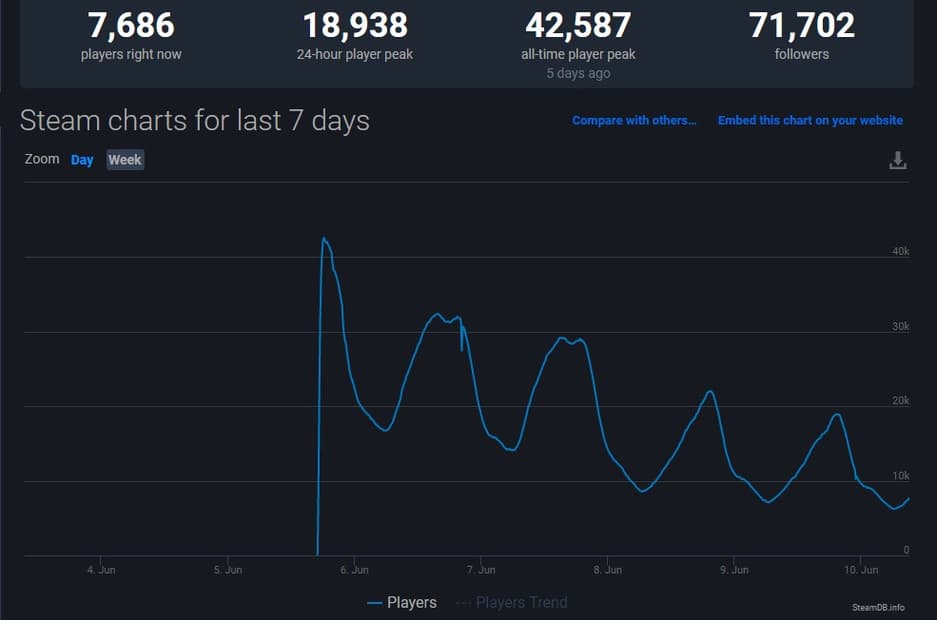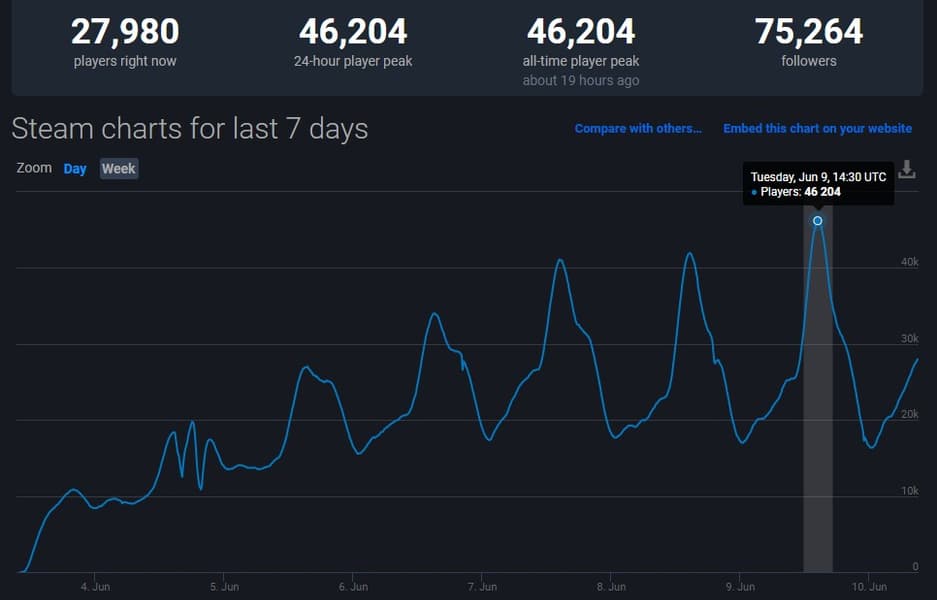 Вчера вечером, согласно данным SteamDB на пике в игре находилось 46 204 игрока. Следует помнить, что версия Sea of Thieves, выпущенная в Steam, включает в себя все содержимое более чем двухлетних постоянных бесплатных обновлений, а также кроссплей с игроками версий Xbox One, Windows 10 и Xbox Game Pass.