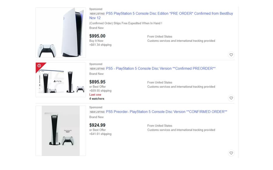 Предварительная продажа PS5 началась, и проблемы с доступностью консолей уже появились в некоторых странах. Любители лёгкой наживы решили воспользоваться удачной ситуацией и на eBay и других порталах появилось множество предложений с перепродажей предварительных заказов. Чаще всего сумма превышает 900 долларов.