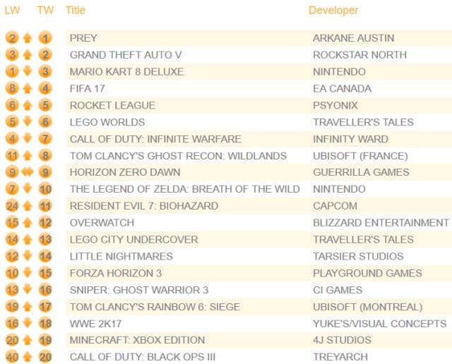 На первое место пробрался приключенческий боевик Prey, стартовавший на прошлой неделе со второй позиции. Это первый проект от издательства Bethesda со времён перезапуска Doom 2016 года, которому удалось занять первое место в британском чарте продаж. Стоит отметить, что значимых релизов на прошлой неделе не было.