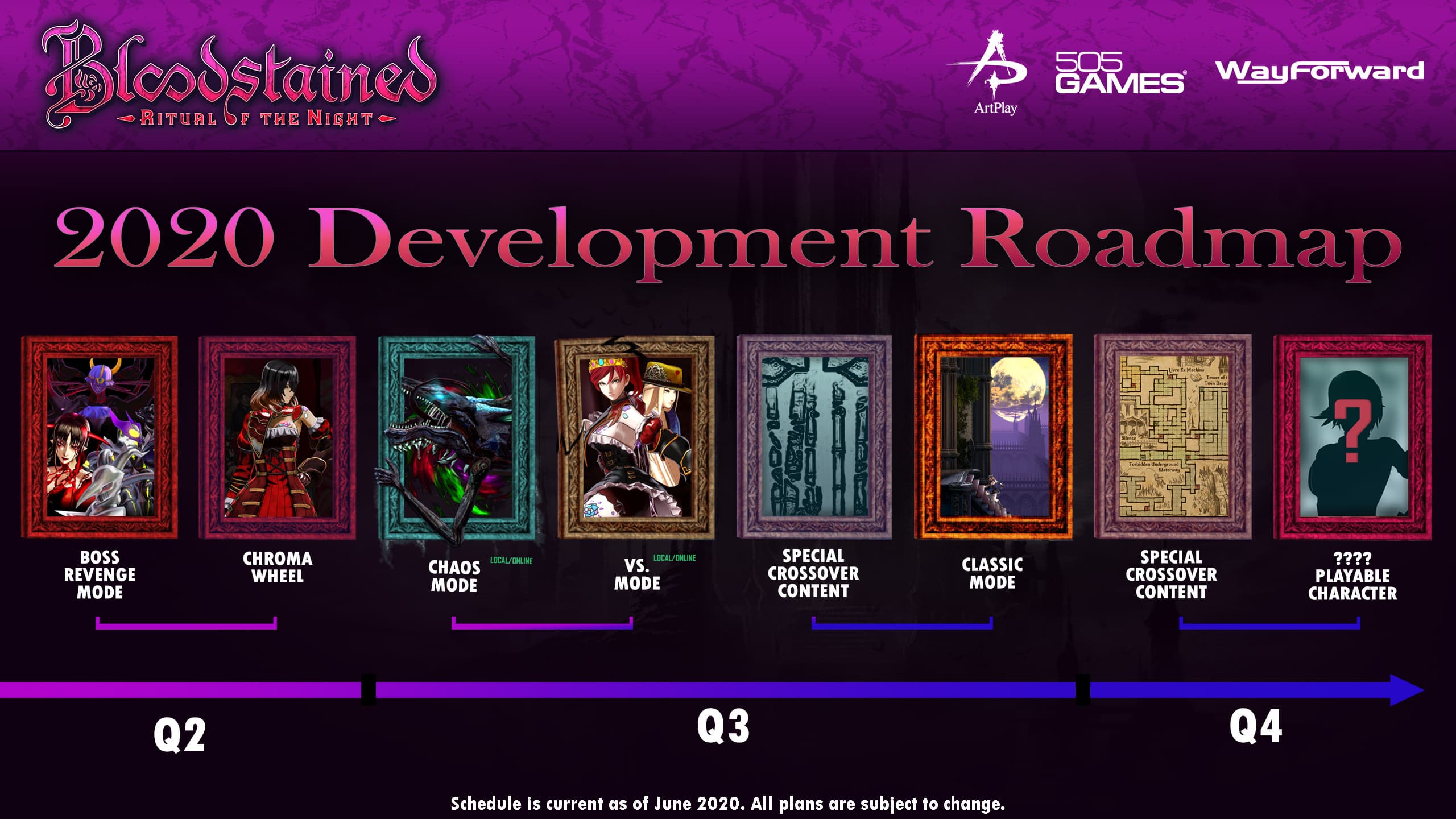 В третьем квартале в проект добавят режим VS Mode, в котором игроки выживают в непростых условиях и пытаются атаковать друг друга «непрямыми методами», режим Chaos Mode, посвящённый сражению с боссами, и Классических режим, в котором Мириам проходит пять уровней и сражается с мини-боссами. Прилагаются мероприятия с участием героев других вселенных.