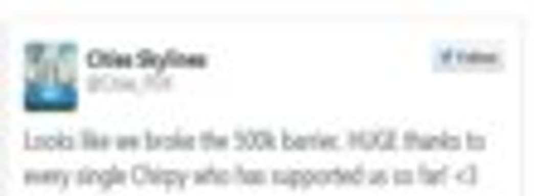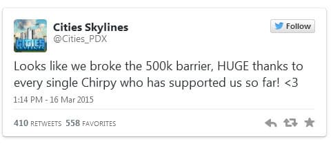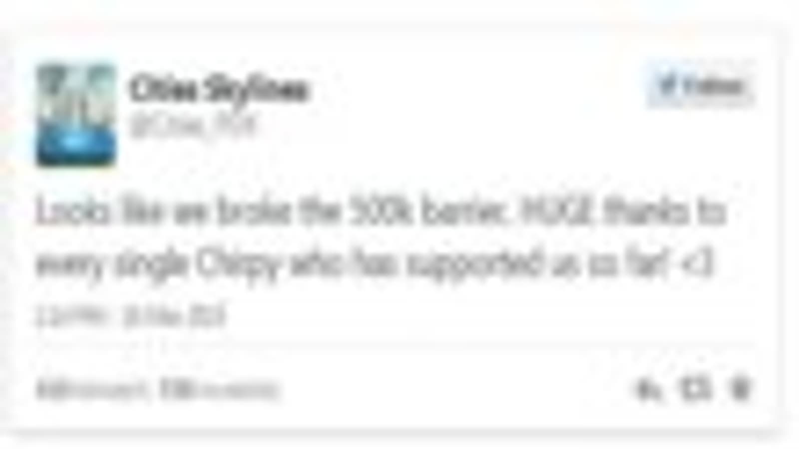 Чуть позже на официальной twitter-страничке Cities: Skylines разработчики игры поблагодарили поклонников за поддержку, сообщив о том, что за неделю продажи игры превысили 500 тыс. копий.