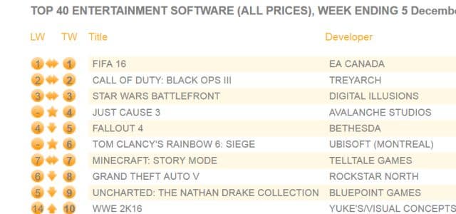 Компания Chart-Track опубликовала свежие данные о продажах игр на территории Соединённого королевства. Тройка лидеров осталась неизменной, несмотря на ожидаемое падения продаж после «чёрной пятницы». Лидерство сохранил футбольный симулятор FIFA 16 (продажи упали на 41%), второе место осталось за Call of Duty: Black Ops III (-32%), «бронзу» вновь получил сетевой шутер Star Wars: Battlefront (-34%).