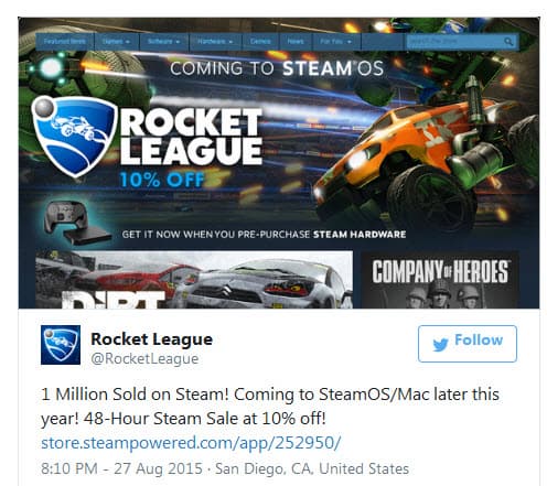 Разработчики из Psyonix сообщили о том, что продажи компьютерной версии игры Rocket League, которая является гибридом гонок и футбола, в Steam превысили отметку 1 млн копий.