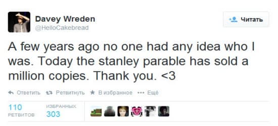 Создатель The Stanley Parable Дэйви Вреден (Davey Wreden) на своей twitter-страничке оставил следующее сообщение: «Несколько лет назад обо мне никто не слышал. А сегодня продажи The Stanley Parable превышают 1 млн копий. Спасибо вам».