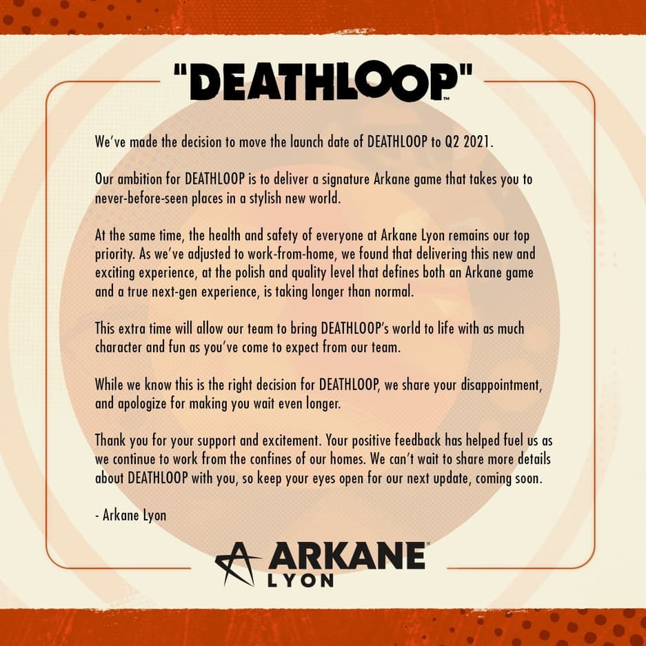 Разработчики отметили, что дополнительное время позволит им улучшить проект, извинились перед пользователями за то, что им придётся подождать релиз Deathloop, поблагодарили всех за поддержку и отметили, что новости об игре появятся в обозримом будущем.