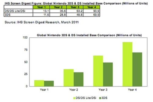 По прогнозу аналитической компании Screen Digest, к концу текущего календарного года продажи новой портативной консоли 3DS составят 11,6 млн. копий. Такими темпами, считает Screen Digest, к 2015 году суммарные продажи новой портативной консоли составят почти 70 млн. консолей.