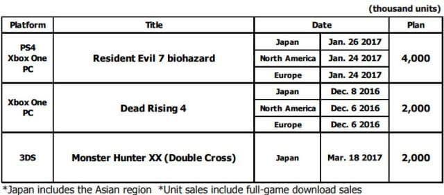 Capcom сообщила о том, сколько копий Resident Evil 7, Dead Rising 4 и Monster Hunter XX компания намеревается продать к концу марта 2017 года. Прогнозируемые продажи указанных выше игр включают в себя как «дисковые» версии, так и цифровые.