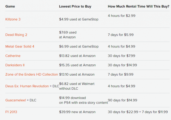 На сайте GameSpot опубликовали таблицу, в которой сравнивается стоимость проката различных игр в ходе бета-теста PlayStation Now с ценой подержанных и новых игр в различных западных магазинах.