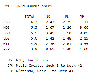 По данным Nintendo, самой продаваемой консолью в этом году является PS3 с продажами на уровне 6,3 млн. единиц. На втором месте идет DS, которая совсем не намного опережает Xbox 360. Далее идут 3DS, Wii и PSP.