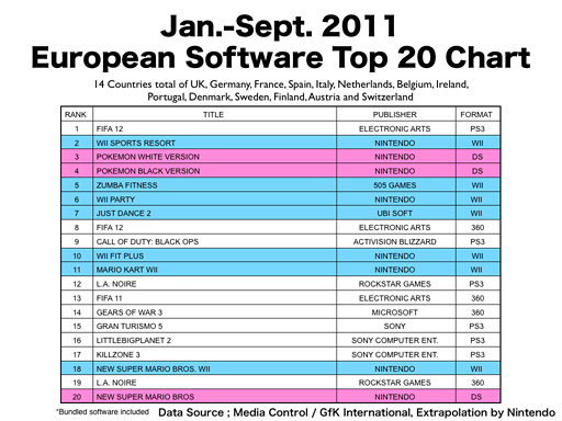 В Европе самой продаваемой оказалась версия FIFA 12 для PS3, но большинство остальных мест в Top10 досталась играм для консолей Nintendo. L.A. Noire и прошлогодний Call of Duty: Black Ops для PS3 продаются лучше Gears of War 3, а Killzone 3 - лучше L.A. Noire для Xbox 360. Ну хорошие продажи PS3 и игр для ней в Европе - это давно известный факт.