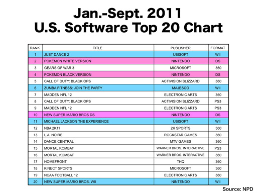 В США ситуация совершенно иная - больше всего игр в Top 20 вышли для Xbox 360, но половину (лучшую) мест в десятке все же занимают игры для консолей Nintendo. Вышеупомянутая Gears of War 3 в США заняла третье место.