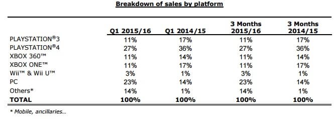 Компания Ubisoft поделилась данными о продажах за прошедший квартал, который закончился 30 июня. 27% от общего объема продаж пришлось на долю PS4, при этом второе место неожиданно занимает РС с 23%.