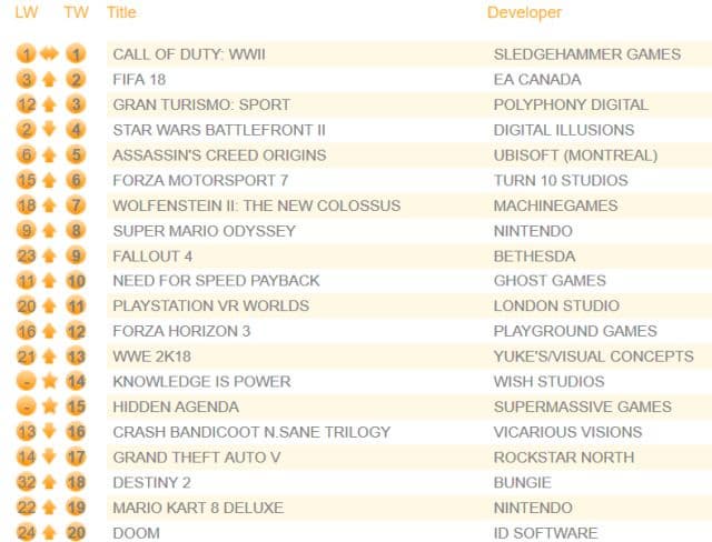 Что касается игр, то на первом месте остался шутер Call of Duty: World War II, который удерживает лидерство уже четвертую неделю подряд. На второе место вернулся футбольный симулятор FIFA 18, а третью строчку занял автомобильный симулятор GT: Sport. Шутер Battlefront 2 опустился со второго на четвёртое место. В топ-10 самых продаваемых игр в Британии вернулись два проекта от Bethesda: Wolfenstein II: The New Colossus (7-е место) и Fallout 4 (9 –е место).
