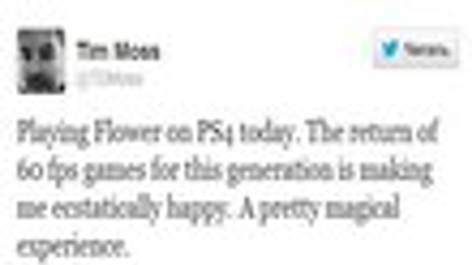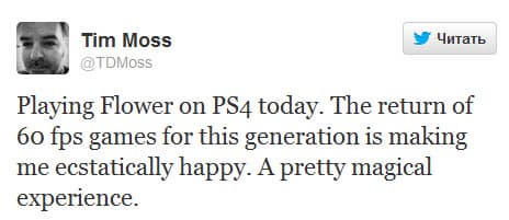 «Сегодня играл в Flower на PS4. 60fps в играх для нового поколения консолей делает меня абсолютно счастливым. 1080p/60fps, много отличного АА и дополнительная детализация травы. PS4-версия Flower выглядит действительно здорово».