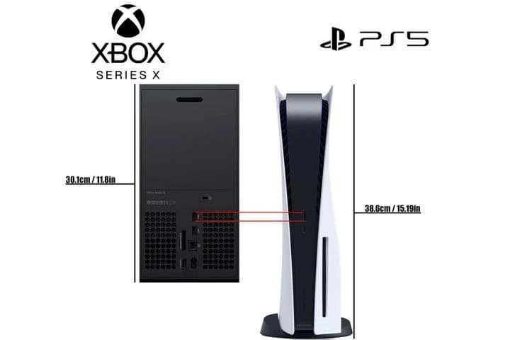 В сети появилось изображение cо сравнением размеров PS5, и Xbox Series X. В качестве ориентира для сравнения автор использовал USB-порт. Похоже, при вертикальном расположении консоль Sony будет примерно на 8,5 см выше устройства Microsoft, но определенно уже.