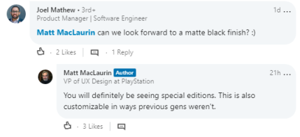 Мэтт Маклаурин прокомментировал вопрос игроков, которые спрашивают, стоит ли ждать черную версию PS5. Вице-президент по проектированию дизайна подтвердил, что мы обязательно увидим специальные версии консоли и добавил, что новая консоль Sony получит некие параметры кастомизации, которых не было у предыдущего поколения.