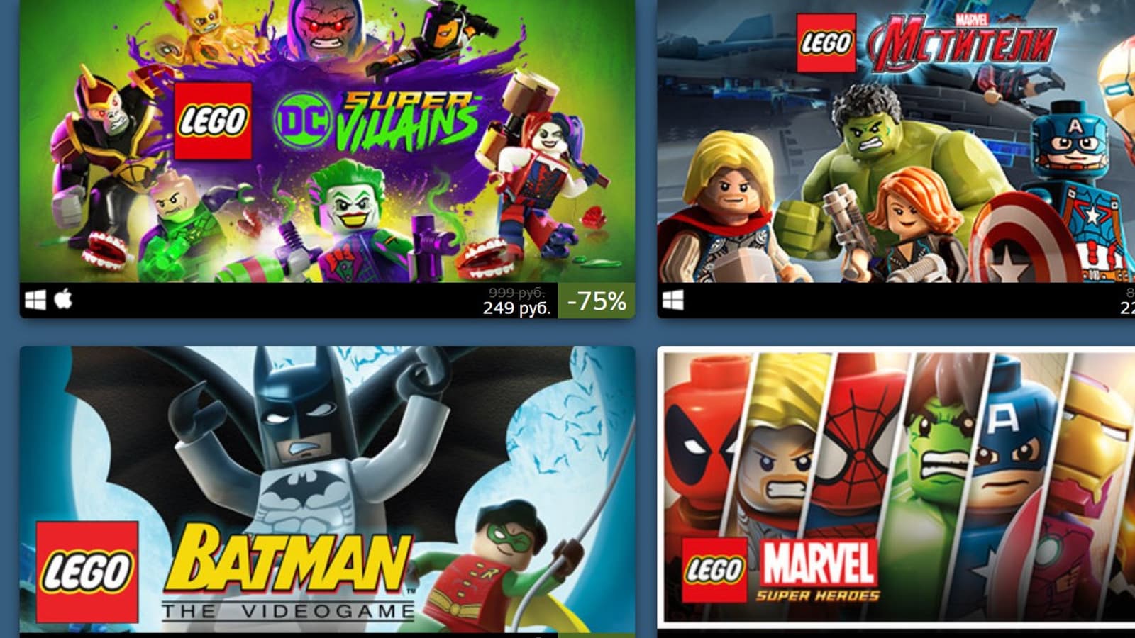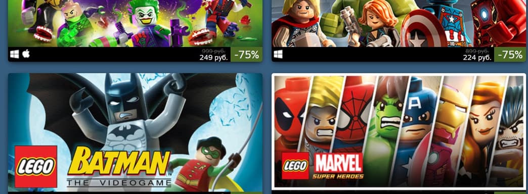 В Steam началась очередная распродажа игр. На этот раз коллекцию можно пополнить серией LEGO и при этом приобрести игры с большими скидками. Снижение цены получили игры по “Гарри Поттеру” и “Звездным войнам”, “Индиана Джонс” а также тайтлы по вселенным DC и Marvel и другие. Многие из них можно приобрести на 80% дешевле чем обычно.