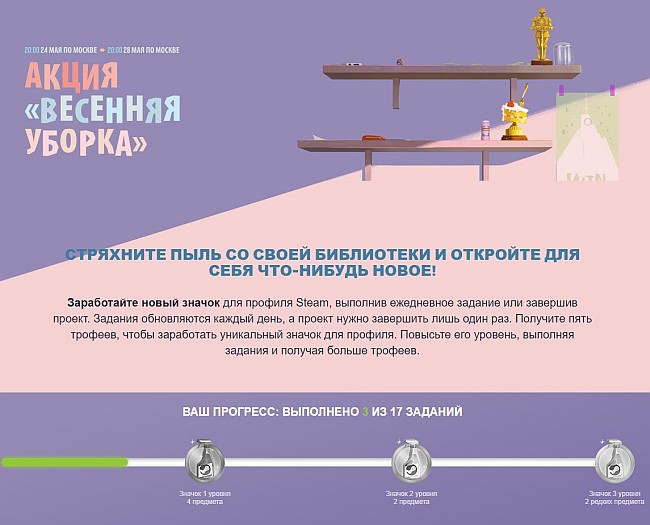 Чтобы как-то помочь разобраться с этим хаосом, компания Valve стартовала акцию «Весенняя уборка», в рамках которой вам предлагают обратить внимание на старые игры из вашей коллекции, чтобы заработать подарки: значки для профиля и редкие предметы. Для этого вам потребуется выполнять простые действия:
