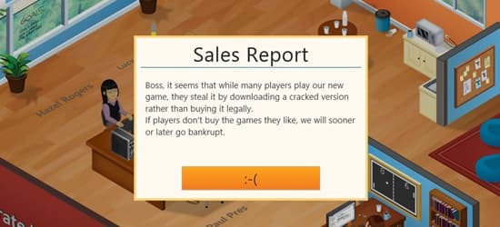 «Через пару минут после того, как мы начали официальные продажи Game Dev Tycoon, мы сразу же выпустили в Сеть взломанную версию игры, которая является практически идентичной лицензионной версии с одним важным отличием…».