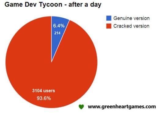 Также разработчики опубликовали график, который демонстрирует, что более 93% игроков предпочли пиратскую версию Game Dev Tycoon.