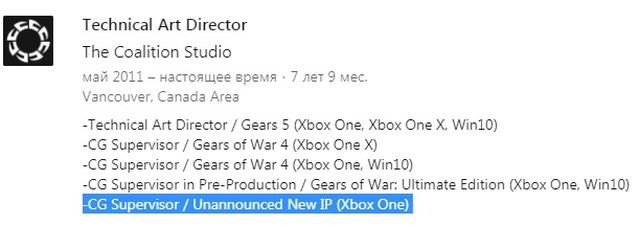Но, похоже, разработчики не теряют времени даром и работают одновременно над двумя проектами. Один из них «неанонсированная, новая интеллектуальная собственность для Xbox One». Информация появилась в профиле технического арт-директора The Coalition Колина Пленти на Linkedin. Пленти работает в The Coalition более семи лет.