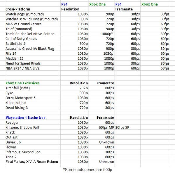 На сайте DualShockers опубликовали всю доступную на данных момент информацию о разрешениях и частоте кадров в играх для новых консолей PlayStation 4 и Xbox One.