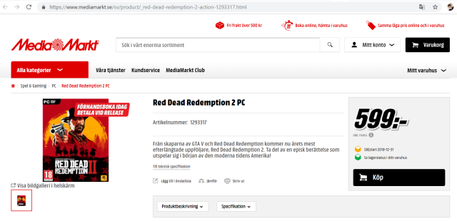 На сайте магазина появилась страница Red Dead Redemption 2 для PC с датой выхода 31 декабря 2019 года. Чуть позже возможность покупки, цену в 599 крон и дату удалили, но посмотреть наименование можно по ссылке. Стоит учитывать, что товар, указанный на сайте магазина может быть ошибкой или обычным заполнителем продукта, который ожидаемо появится в ближайшее время.