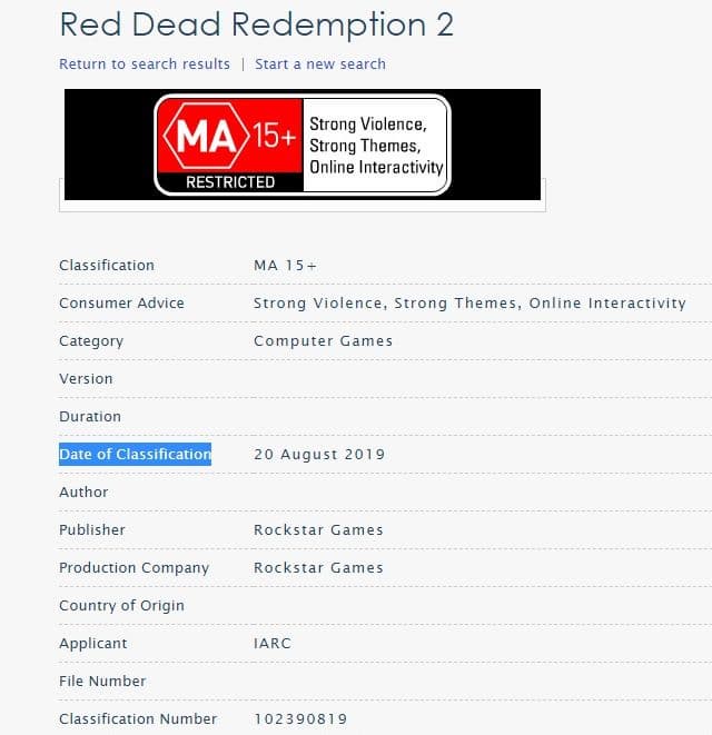 На портале Австралийской квалификационной комиссии появился возрастной рейтинг у Red Dead Redemption 2. На странице указана дата 20 августа и допустимый возраст 15 лет и старше. Ранее комиссия присваивала такой же рейтинг версиям игры для консолей. Можно с большой долей вероятности предположить, что речь идёт о PC-версии игры, хотя на странице упоминания об этом нет.
