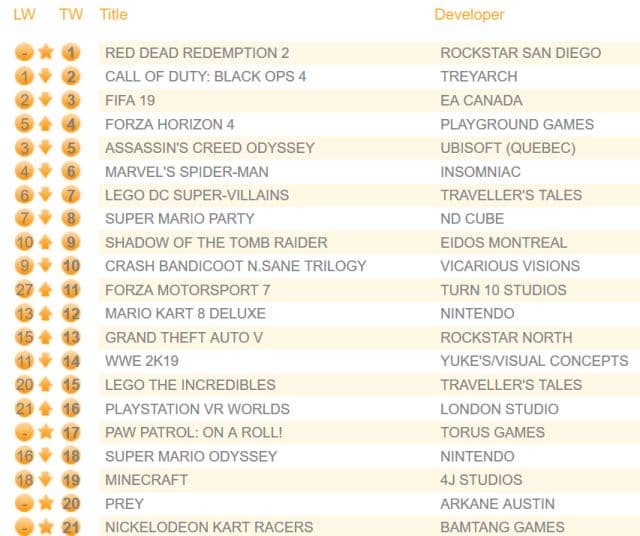 В списке самых быстро продаваемых игр в Британии за этот год новый проект от Rockstar занял второе место, пропустив вперёд лишь FIFA 19. Отмечается, что за первую неделю Red Dead Redemption 2 продался значительно лучше, чем Call of Duty: Black Ops 4. Также вторая часть Red Dead Redemption продаётся в два с лишним раза лучше, чем оригинал 2010 года выпуска.