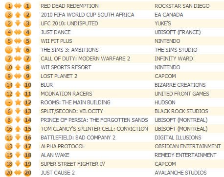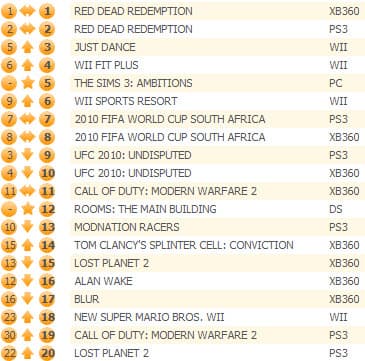 Третью неделю подряд вестерн Red Dead Redemption удерживается на первой позиции. Футбольный симулятор 2010 FIFA World Cup South Africa поднялся на вторую строчку, отодвинув на третью симулятор боев смешанного стиля UFC 2010: Undisputed.
