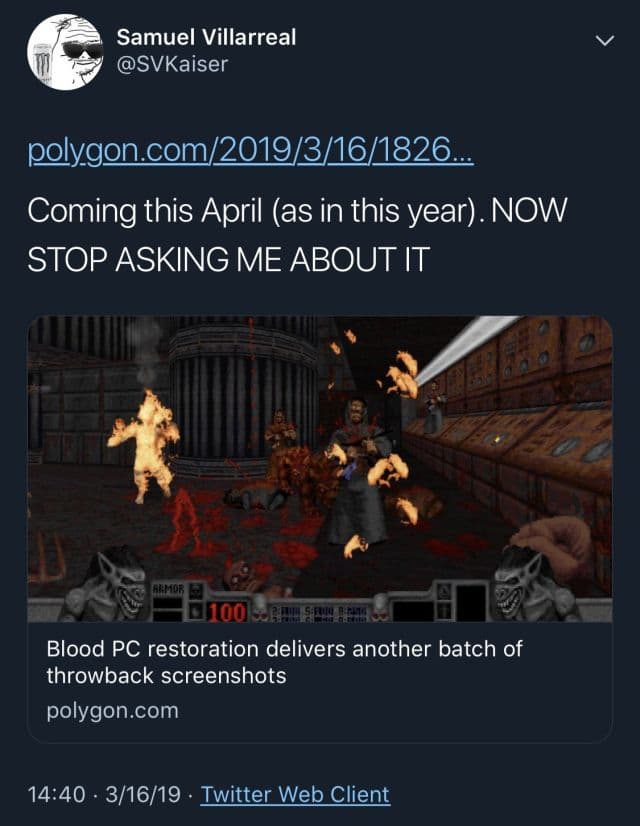 Об этом в твиттере написал энтузиаст и ведущий разработчиков проектов серии Kex (Doom64EX, TurokEX, Turok2EX, ForsakenEX, PowerslaveEX) Самуэль Kaiser Вильярреал, который помогает Nightdive Studios делать ремастер Blood.