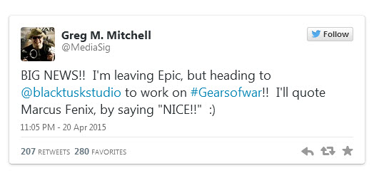 В этот раз речь идет о режиссере кат-сцен Gears of War Греге Митчеле (Greg M. Mitchell), который известил об этом общественность в своем твиттере. Митчел принимал участие в создании всех частей серии.