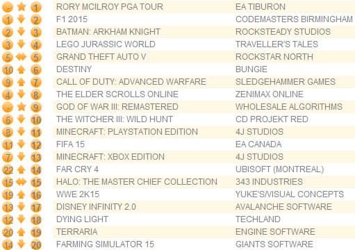 Симулятор гонок F1 2015 опустился на второе место, а Batman: Arkham Knight - на третье. Переиздание God of War III: Remastered для PS4 стартовало с девятой строчки, тогда как оригинал, выпущенный в 2010-м, в свое время занял первое место.