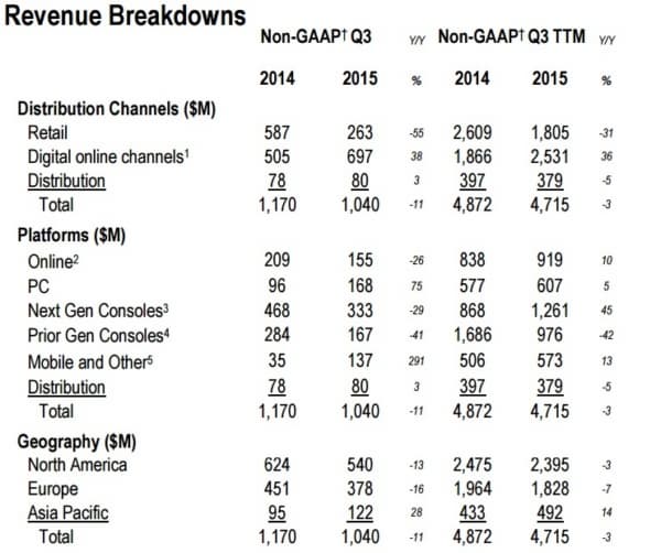 Прошлое поколение консолей держится молодцом, суммарный доход от продаж игр для них составил почти $1 млрд. Всего издатель реализовал игр за три квартала на сумму более 4,7 млрд долларов, половина дохода пришлась на США, чуть меньше — на Европу.