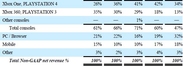 В первом квартале текущего финансового года (пятая колонка) все консоли принесли издателю 47% дохода, тогда как на долю РС и браузерных игр пришлось 32% (годом ранее - первая колонка - этот показатель составлял 21%).