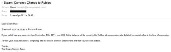 В письме говорится о том, что в ближайшее время, вероятно, уже на следующей неделе, игры для российских пользователей Steam будут оцениваться в рублях. Если к 13 сентября в вашем виртуальном кошельке еще останутся доллары, то они будут конвертированы в рубли по рыночному обменному курсу на тот момент.