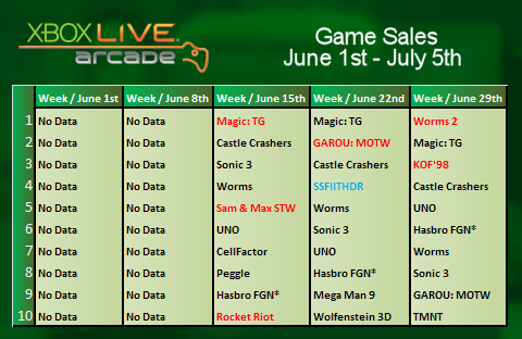 На сайте Gamasutra опубликовали список самых продаваемых игр сервиса Xbox Live Arcade за три недели, с 15 июня по 5 июля. Наиболее успешной игрой на первой неделе была Magic the Gathering, которая сохранила лидерство и на второй неделе, однако в итоге ей пришлось уступить первое место Worms 2.